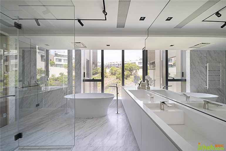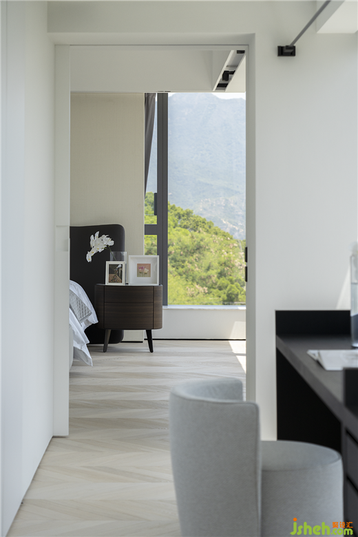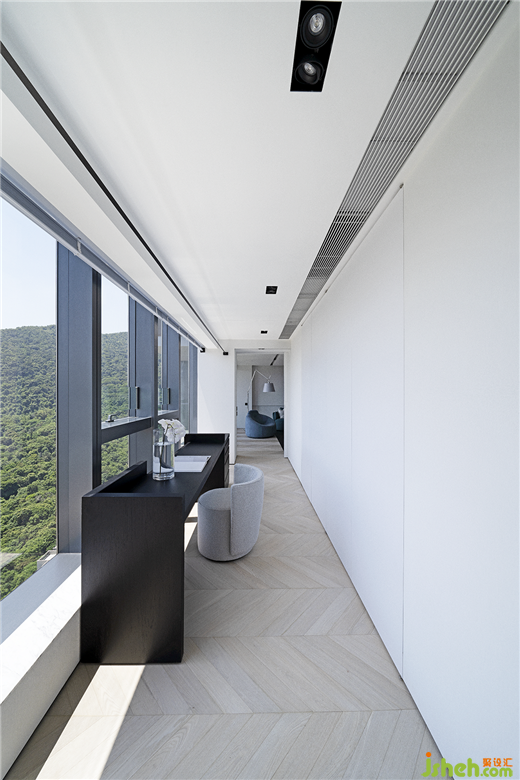 留白的空间看似不具备功能性,实则是一种平衡感的塑造。香港私宅设计通往主卧的长过道,设置了一套黑色书桌,自然形成了半隔断缓冲场景,视野随着玻璃窗向外延展,充满生命力的自然之美无处不在。