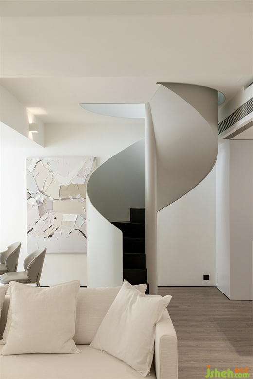 简约黑白造型的旋转楼梯,优美的弧线和极致工艺彷佛一件艺术品伫立于此,横向和纵向点亮了每个留白的空间,其空间的生命张力令人惊喜,隐隐渗透着家的无穷力量。