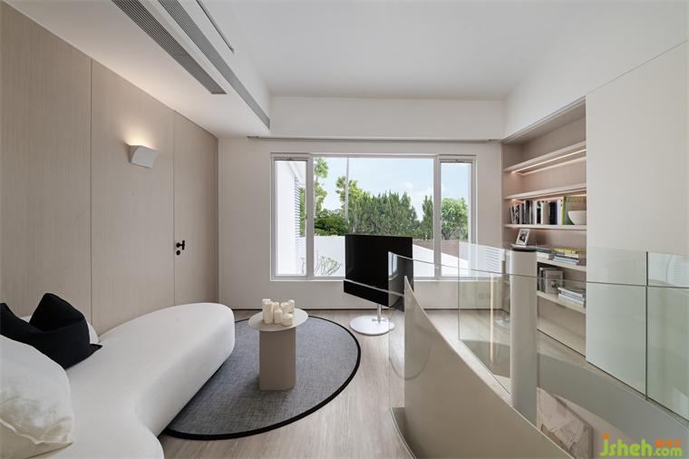 二层为休息区域,整体延续了简洁静谧的空间调性。香港独立屋设计沿着旋转楼梯徐徐向上,先是进入私人休闲小客厅。这里的功能不被定义,自由随性,可以是夏日午后的独处阅读,也可以是冬日周末的沉浸式看电影...