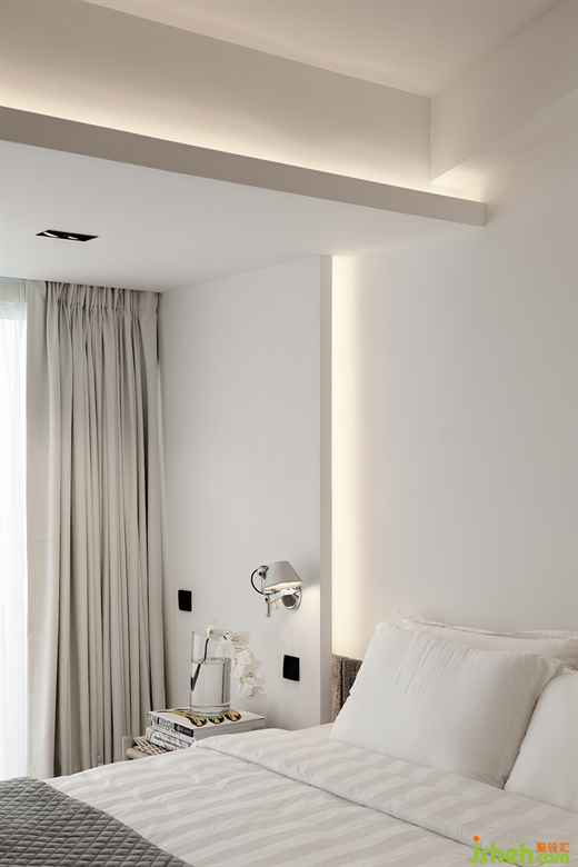 卧室基本采用隐藏式的照明设计,创造出舒适宁静的空间氛围和情绪,素雅简洁的整体布置,平和有序,令人心情舒畅,松弛回味自己的趣味人生。