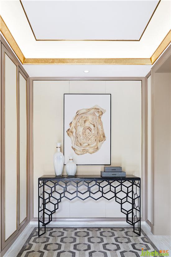 在玄关,围绕主题展开的蜂巢造型端景台,通过几何变换延伸出轻盈别致的艺术性。装饰画似金色玫瑰优雅绽放,又仿若花蜜清莹欲滴,恰到好处点缀了空间的视觉中心,勾勒出彬彬有礼的迎迓场景。