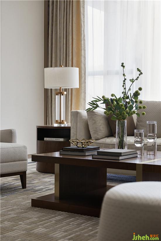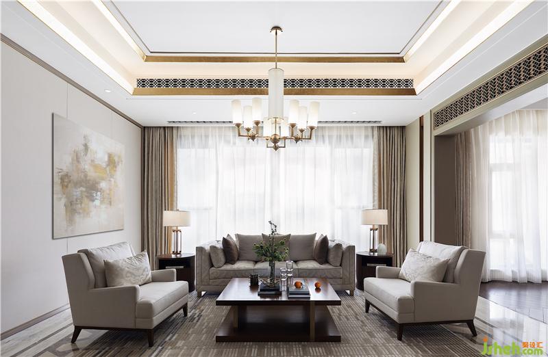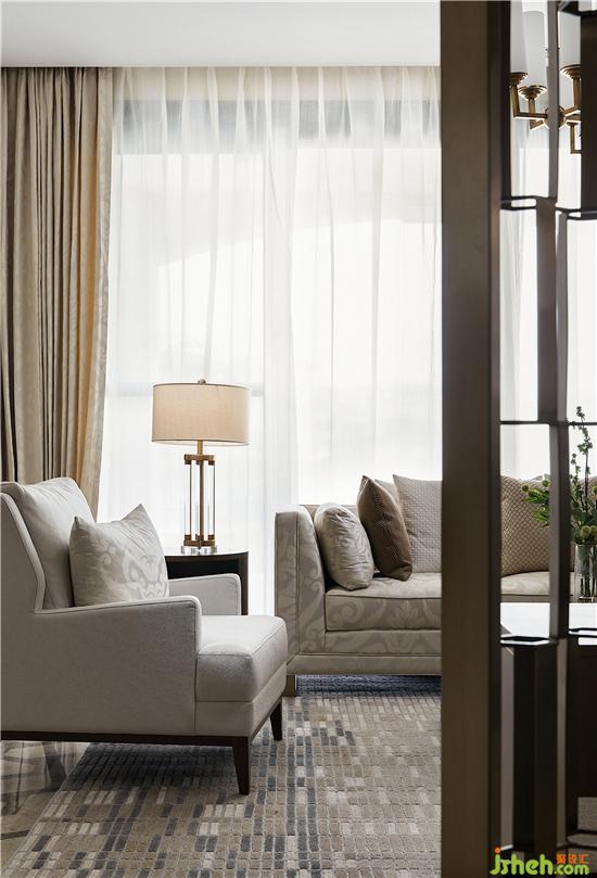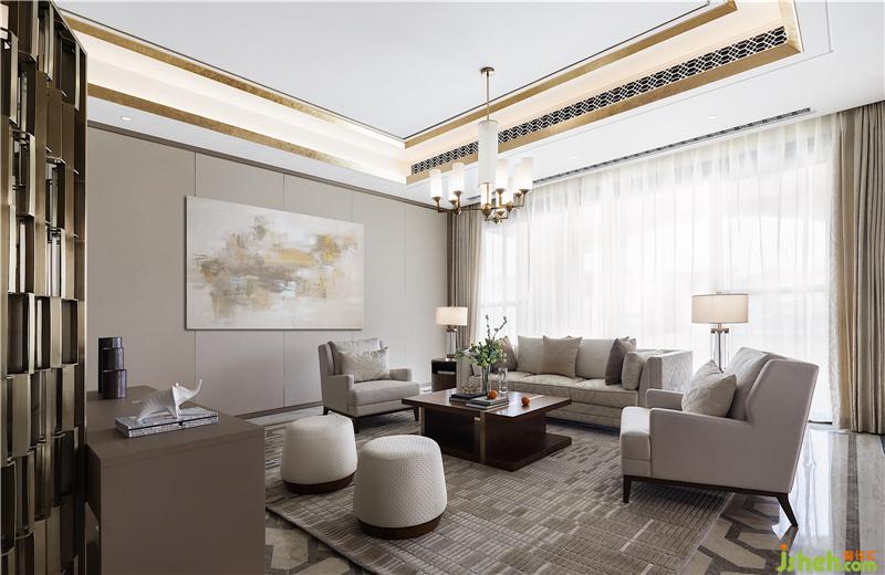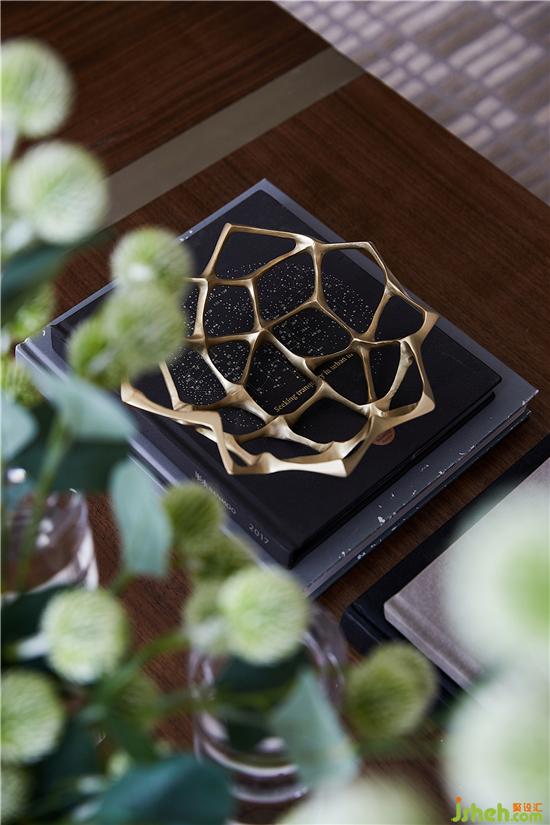 “蜂巢”的灵感概念在空间不断延续,小圆墩上的暗纹肌理依旧能看出设计所想表达的家的凝聚力和安全感。金属镂空隔断增加了视觉上的层次,和质地考究的黑金碗莲摆件一起让家的精致气息脱颖而出。别墅装修设计