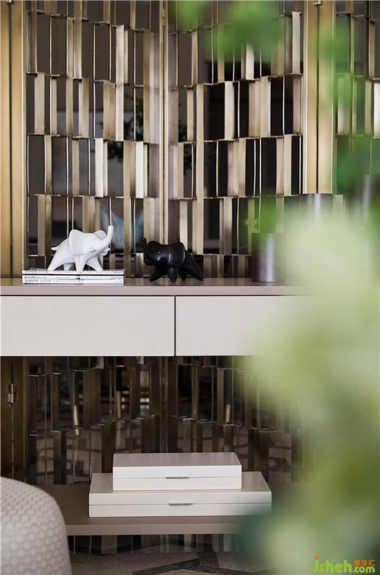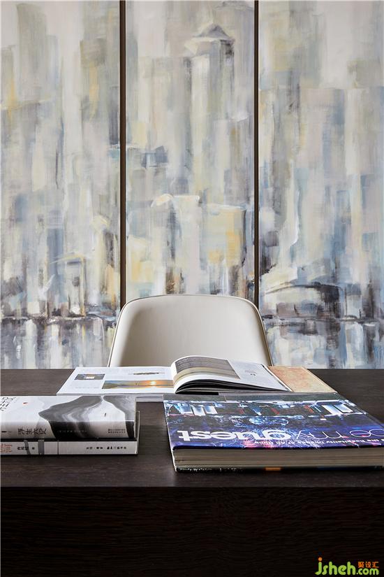 书房位于主卧套房中,空间井然有序,顶天立地式书橱陈列着居者的艺术藏品,身后柜门上抽象手绘画更是将温厚的人文气质刻画得淋漓尽致,书中锦绣三千,任居者肆意挥洒。