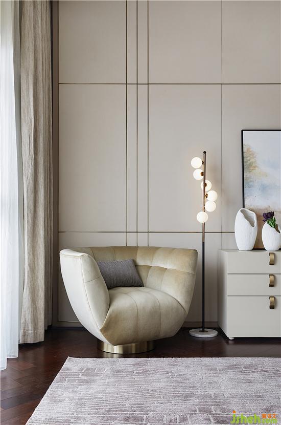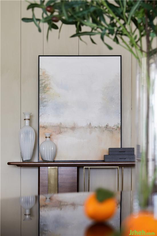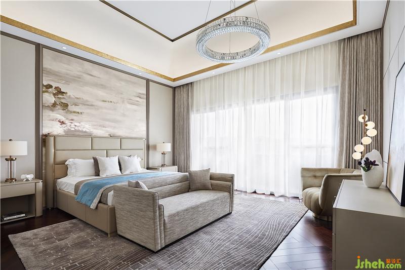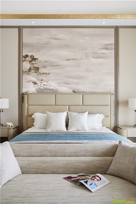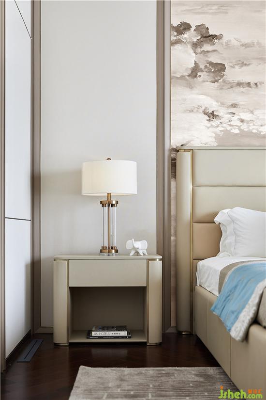 主卧用大幅的写意挂画打破背景墙的素雅,绿意清爽,紫韵朦胧,仿若莫奈的睡莲,水光花影,斑驳闪耀,贴合居者的艺术格调。别墅装修设计