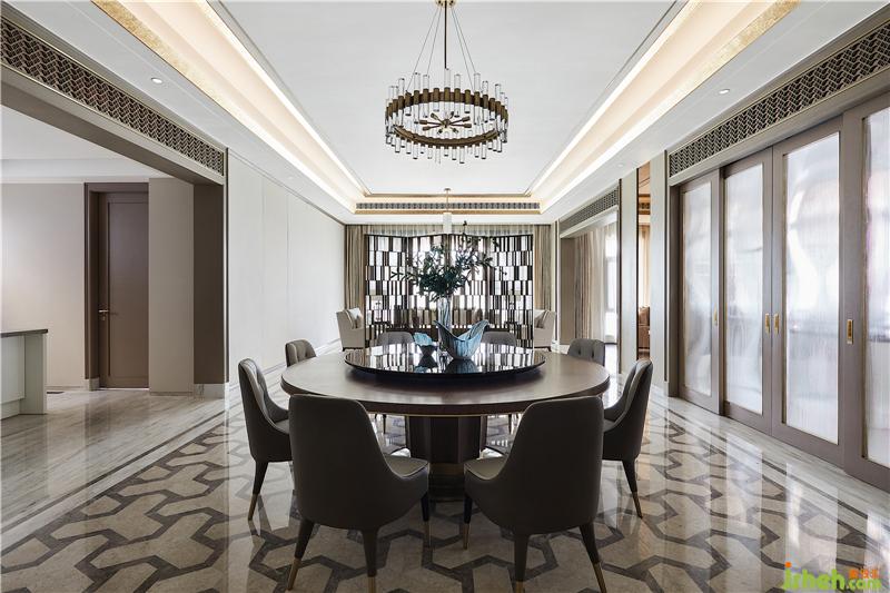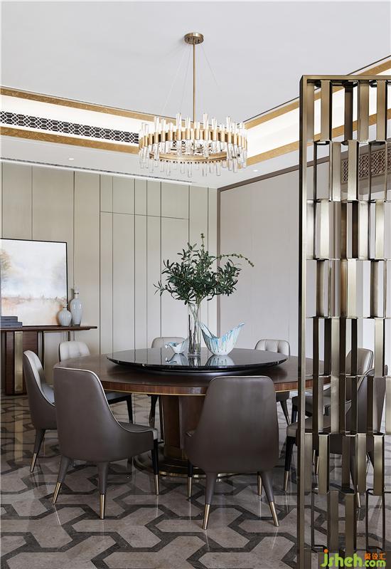 餐厅在米色的基础上添加了更沉稳端严的一笔,描摹家族的餐飨礼序。美是很抽象的东西,但生活的美好模样却可以具象。香气诱人的料理端上桌,一家人聚在一起,水晶灯挥洒星光如水,于高朗的情境中悠然感受人间烟火气。