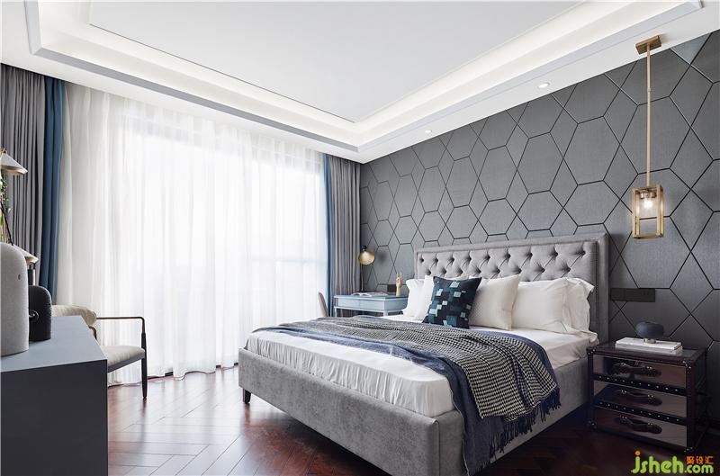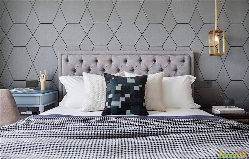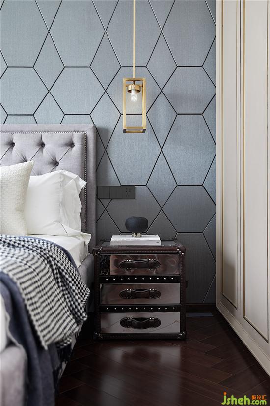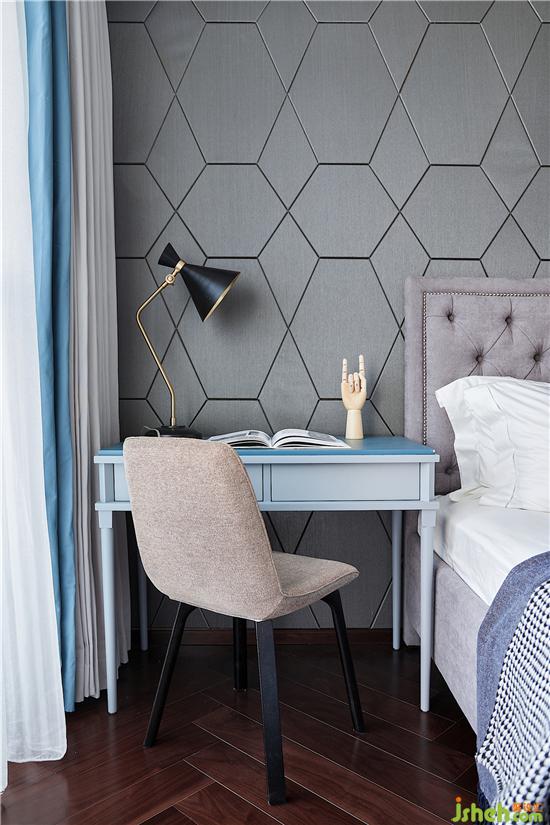男孩房床头背景是经过变幻后的蜂巢概念,规整的几何排布益于孩子思维的拓展开发,不同色块的组合与千鸟格的搭配,是一种潜移默化的美学投射,孩子自由成长不受限。