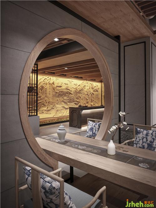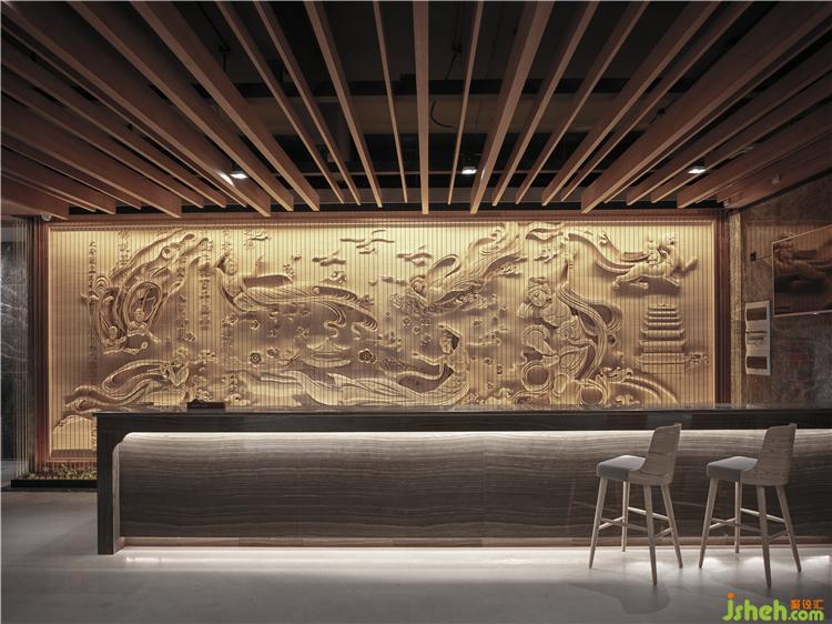 缓步前行,服务总台的背景是雕刻名师的飞天木雕作品,通过精致的线条、传神的形态以及细腻的质感传达历史与文化的底蕴。前方竖直排列的钢丝网屏障,使原本静止的飞天,随着客人的走动而展现出动态的美感,动静怡然的氛围贯穿整个空间,勾勒出既传统又现代的清雅风华,更提升了整体空间虚纳万物的浩然大气感,正应佛语所云:“物不动,心在动”。