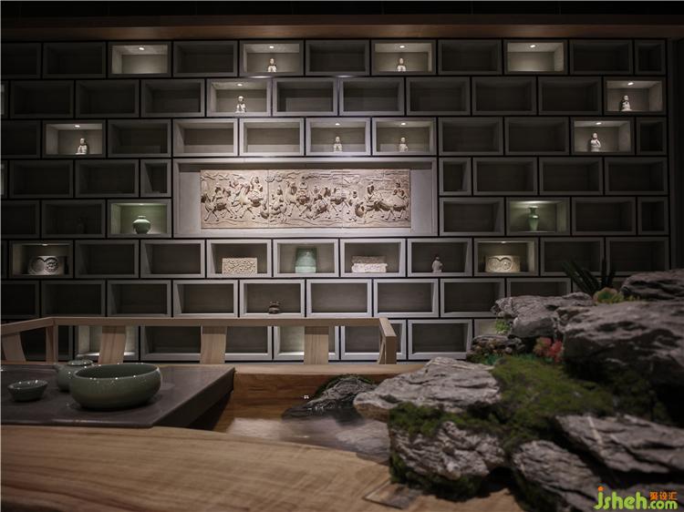 左侧是大堂的禅茶空间,一眼望去,整面墙上有序罗列的壁龛大气磅礴,勾勒出丰富而不繁琐的空间氛围的同时,也诠释着敦煌石窟众多的地域特色。上方的射灯打下来的暖黄色灯光,勾勒出“盒子”的轮廓,营造禅意雅静的空间气韵,形成一种别致的立体感。而类似这样的设计手法,在整个酒店中比比皆是,让置身其中的客人抽离于世俗的喧闹,浮躁的心瞬时平静,沉浸在领略这独特的异域设计艺术的世界里。酒店设计