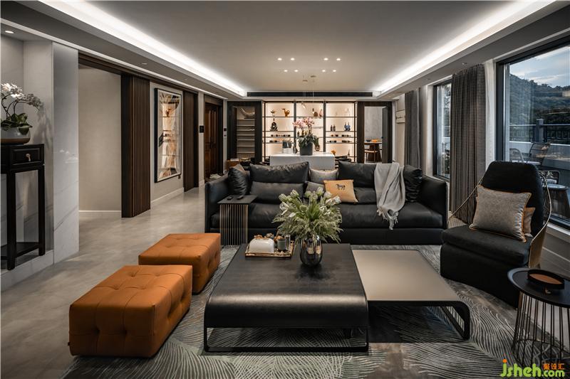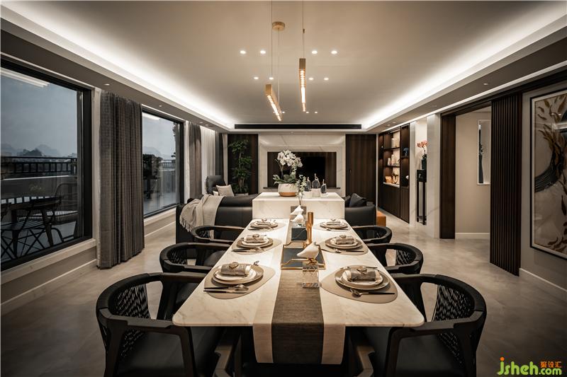 客厅与餐厅没有任何隔墙的设计,不论是坐哪都能看到电视,去掉繁杂,保持着大空间,在软装色调上也保持着统一。