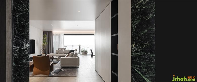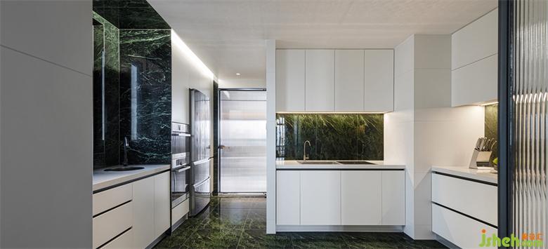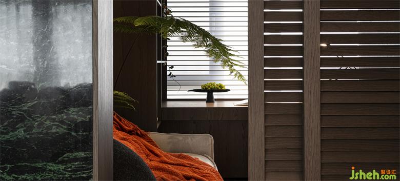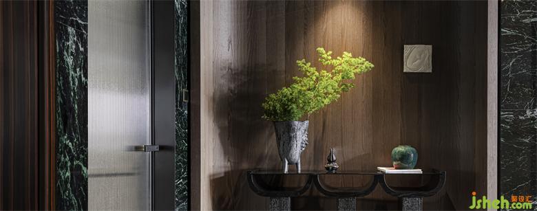 搭以温润的咖色木饰面和肌理感的绿色大理石。