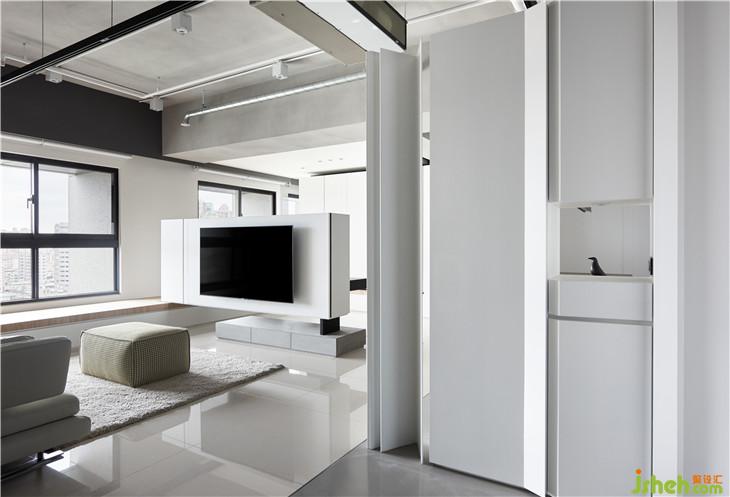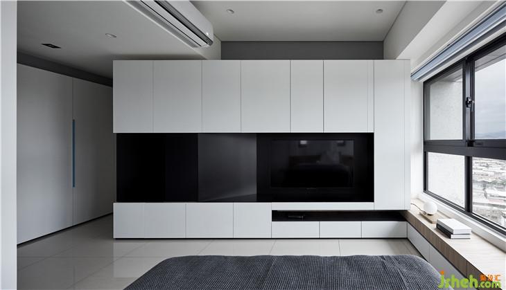 刻意将电视柜体塑造量体感,与旁边卧榻的交错设计,形成虚实介面