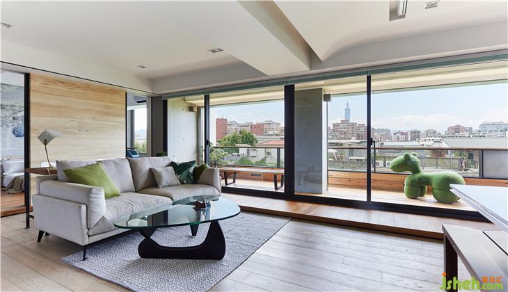 我们刻意内缩的阳台,也利用架高地板延伸到室内,压低的阳台扶手,也将外面树丛带入室内