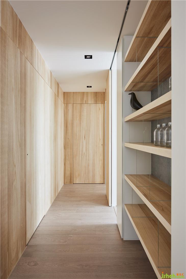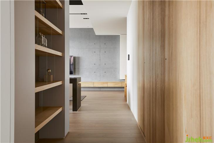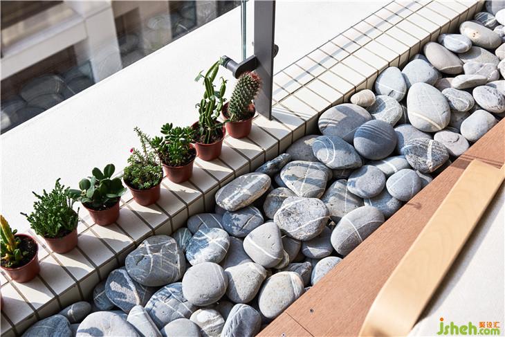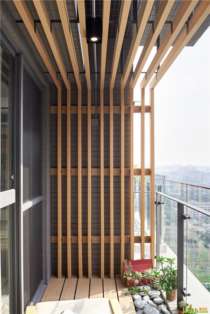 方阳台我们也使用塑木铺设塑造休闲感,高楼层的好视野,塑木延伸至墙面及天花的设计