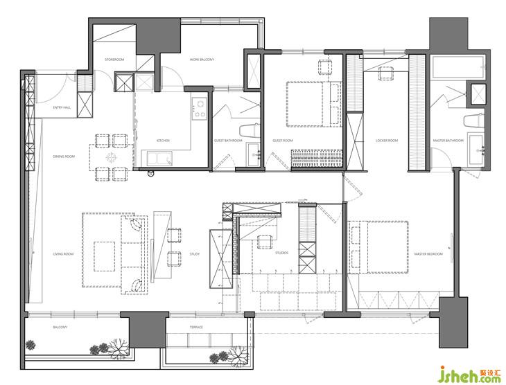 平面配置上,客厅书房为开放式,后方黄色块体为猫屋 ,红色墙面为女主人的工作空间利用一个卧榻结合猫屋。