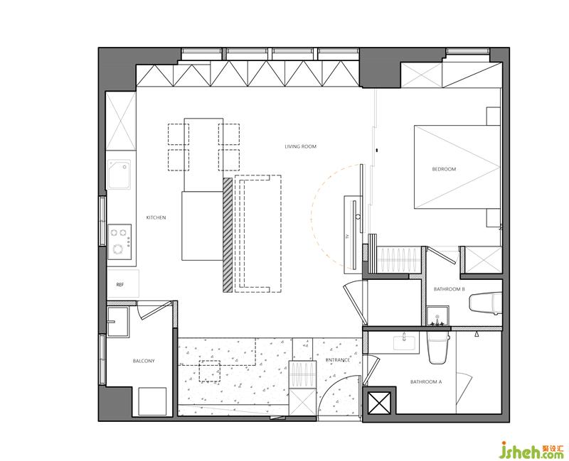 这个20坪老屋的原始隔间把主要的采光都挡住了,加上收纳空间的不足,使得整体感觉有点拥挤;而因为女主人喜欢下厨,除了希望能有较大空间的厨房,也希望整个空间都可以很明亮,于是我们让公共空间集中一侧,浴室潮湿空间集中一角,并整合储藏室。室内设计师
