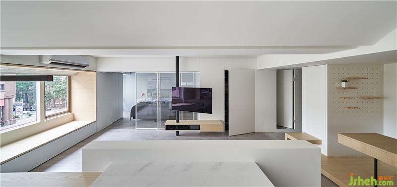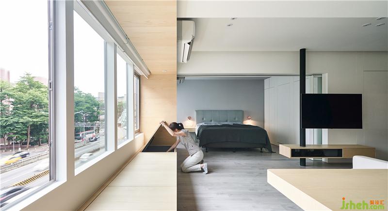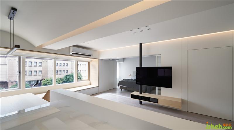 6.主卧用拉门区隔空间,旋转电视让客厅主卧都能看到
