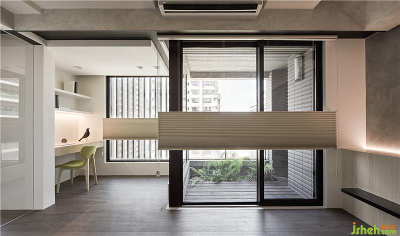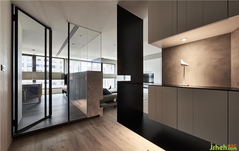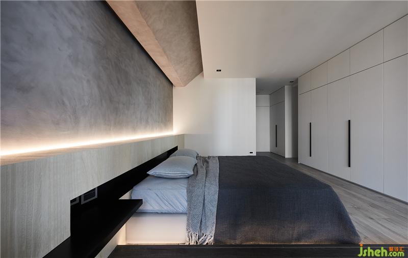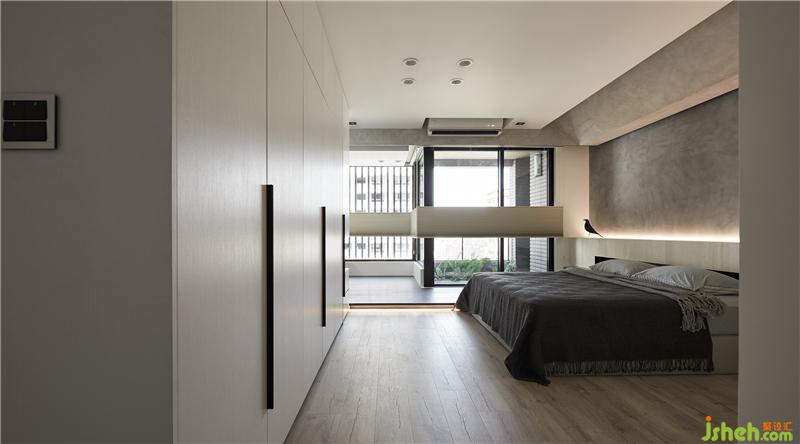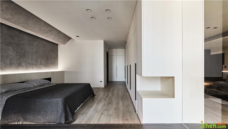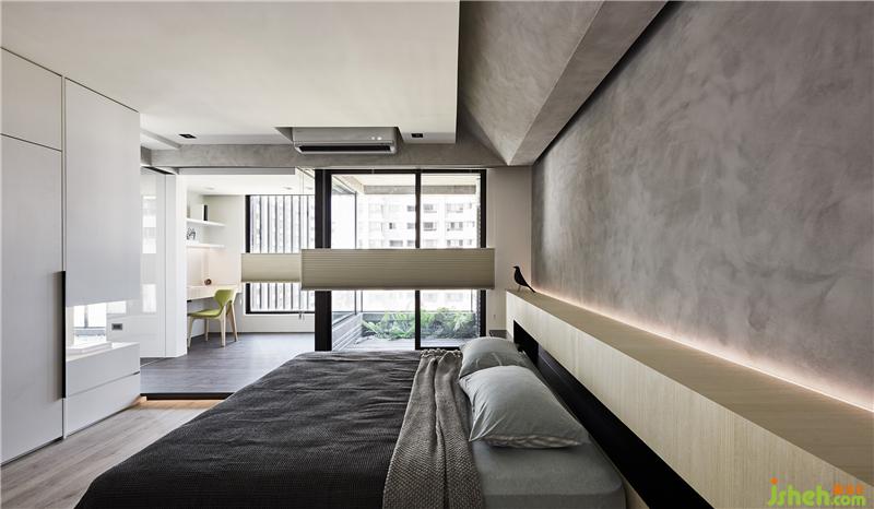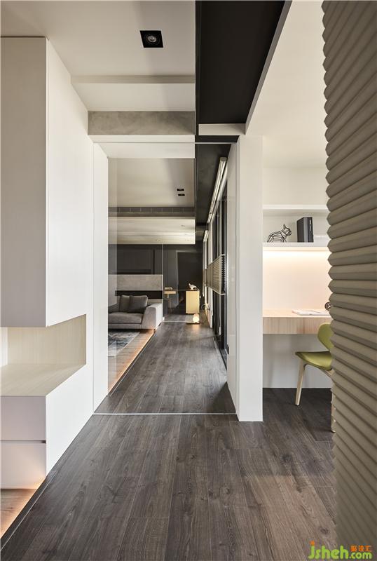 格局设计上主要有两个重点,一是置入玻璃书房,二是打开局部主卧墙面;在设计上,利用架高地板延伸了书房,客厅跟主卧,这是我们常用的设计手法,但这个简单的动作可以让光线跟空间感更有趣;而收纳的部分则尽量集中在两侧且隐藏于空间中。也因为林口较为潮湿,所以这个空间中运用了很多硅藻土涂料,希望能藉由这材质调节空间中湿气。室内设计师