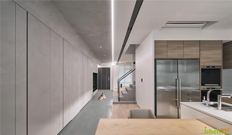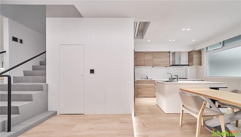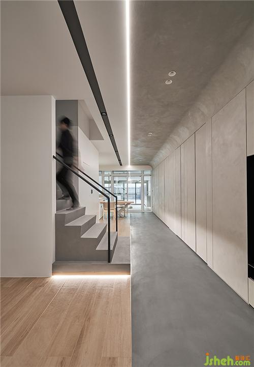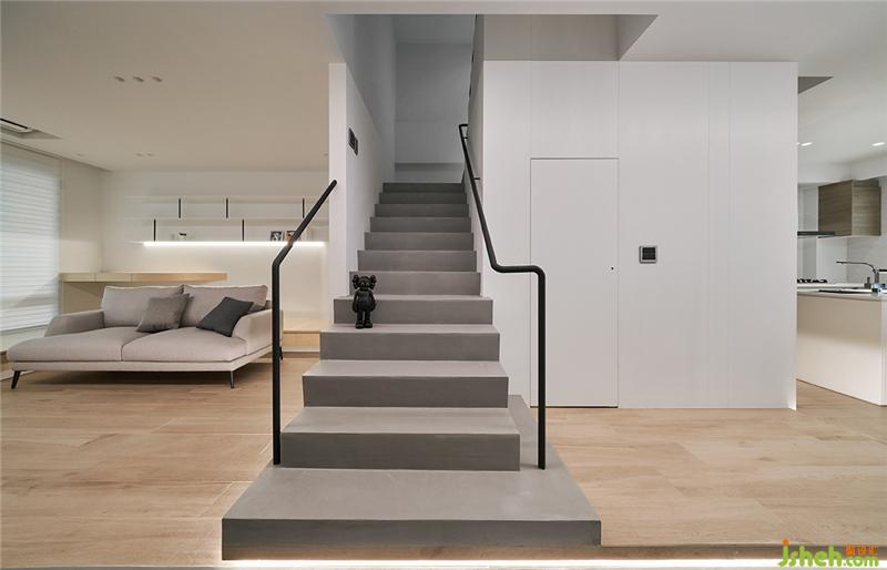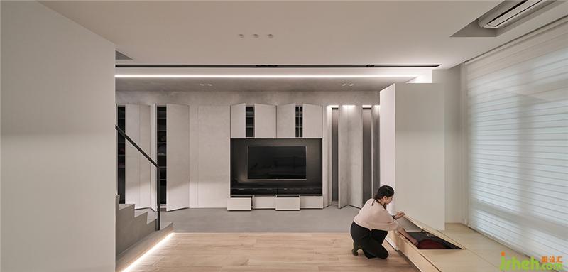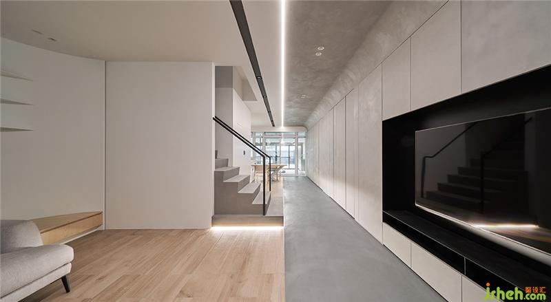 楼梯材质一直延伸到一楼地面然后延续到牆面及天花,有一种蔓延而下的感觉;楼梯左侧为客厅,右侧为开放式厨房。客厅与卧榻、书房整合,卧榻当客人多时旁边都可以坐一整排;在入口处我们设计了一整排收纳柜,也与电视牆面跟鞋柜整合台湾装修设计。