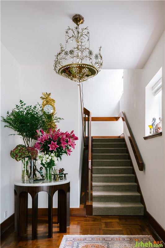 玄关区艳丽的波斯地毯,注入这栋老宅空间新的活力,换鞋椅的那抹艳蓝色和地毯的玫红有了强烈的冲突感,这种冲突感所组成的惊艳,让并列两旁描金的古董装饰柜也有了生机和活力,青花瓷的台灯和抱枕有了轻轻的互应,中西之美在并不大的玄关区,有了这么多的内容交措,所呈现SCD最善长的混搭手法;倚在门廊上的白色鹦鹉,和门外自然堆起的绿植花艺,满满的生活情趣和气息。设计公司