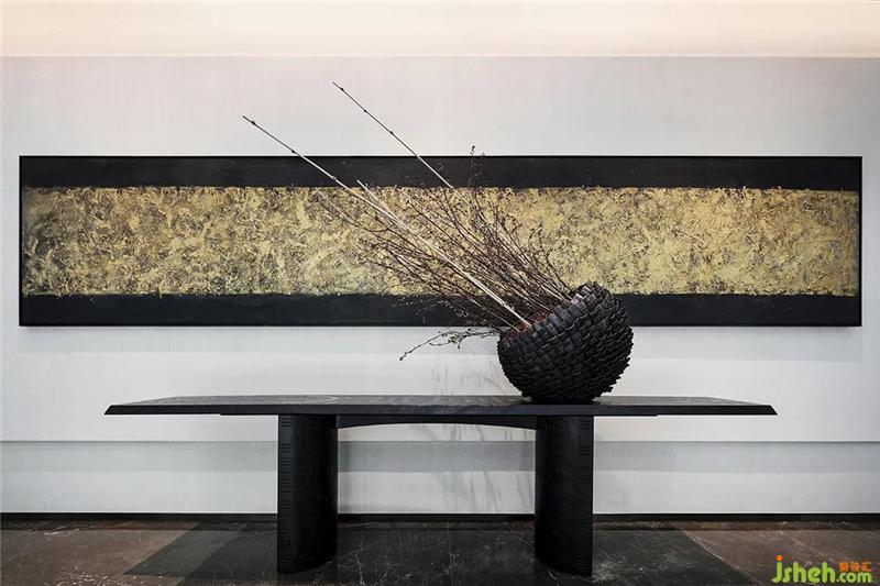 连接洽谈区与影音室的走廊,现代派的艺术花艺成为视觉的交点,利用一片片的竹子纯手工打造的独特花器透露着设计师的巧妙心思,碳化的竹片像层叠的鳞波包裹着娇艳的玫瑰,细长的竹子仿佛从玫瑰里生长而出,静与动,质朴与华丽,仿佛此刻成为优雅的一体。客观环境喧闹不静,但主观感受可以在闹中取静,“寂然独立”便是如此吧。