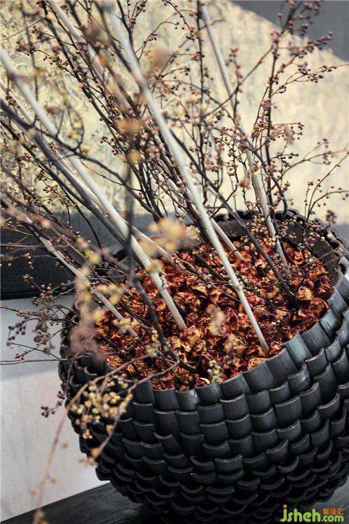 Connection negotiation area and av room corridor, modernist art flower art become visual intersection, using pieces of pure handmade bamboo unique flower implement according to the designer's idea, carbonized bamboo piece like a cascade of scale like ripple wrapped in delicate and charming rose, as if from the roses grow slender bamboo, static with move, plain with luxuriant, as if the moment become elegant. The objective environment is noisy and not quiet, but the subjective feeling can take the quiet in the noise, "silent and independent" is such a bar.