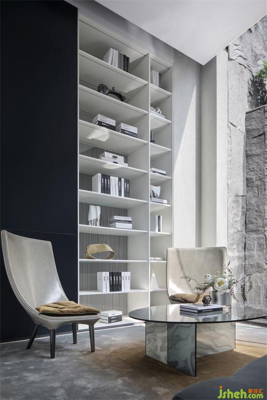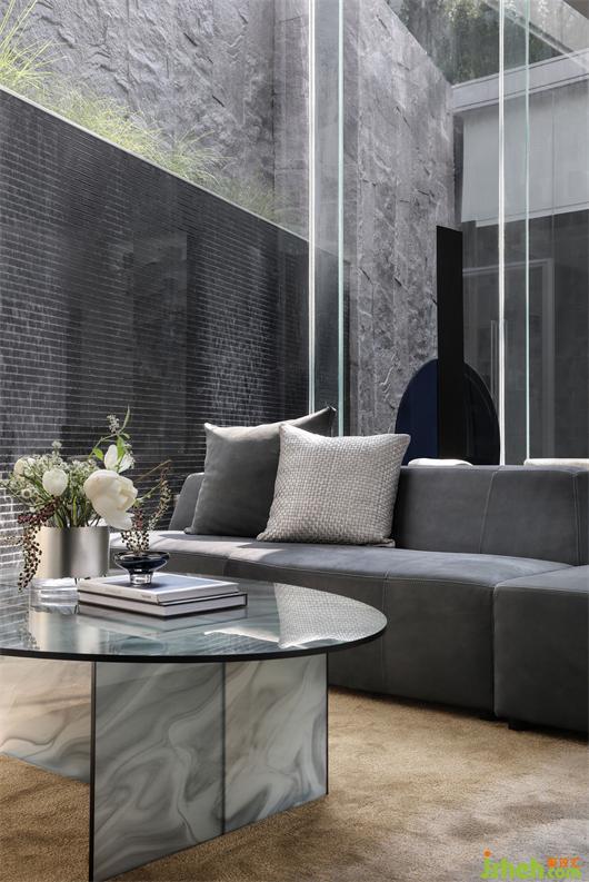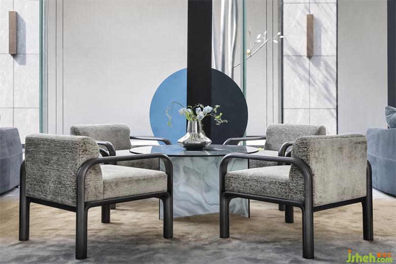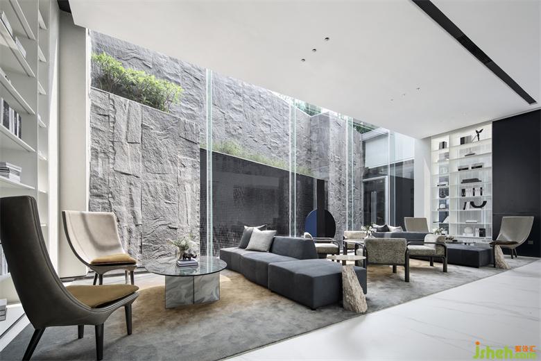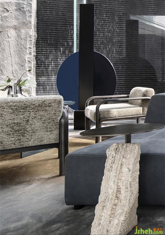 家具的细节石雕,互应了景观的山水造景。王安石曰“‘波’乃水之皮”,以水之皮造波澜,坚如石,柔如波,质地与形态的碰撞是交融。这样的一个洽谈茶几,亦玩味出了中国文人心中的水墨山水。“山栖谷隐”这种写意的表达手法,也让人顿悟设计不仅是样式、造型、材料这些维度。它更是人心中对于山水、自然和理想生活的写照,打破了设计的冰冷与傲慢,变得诗意且温暖。