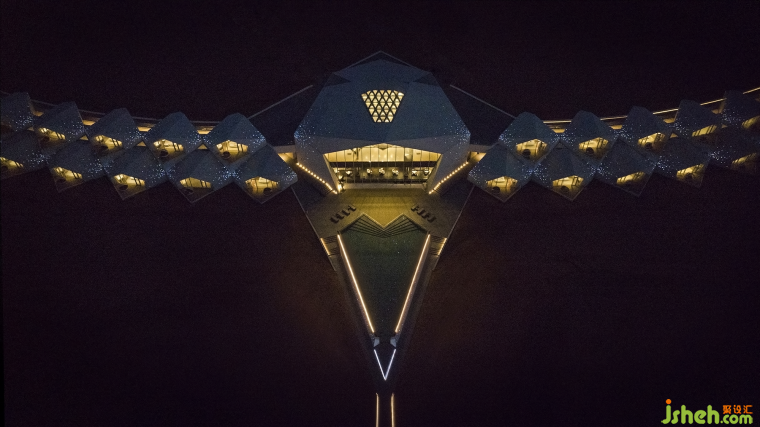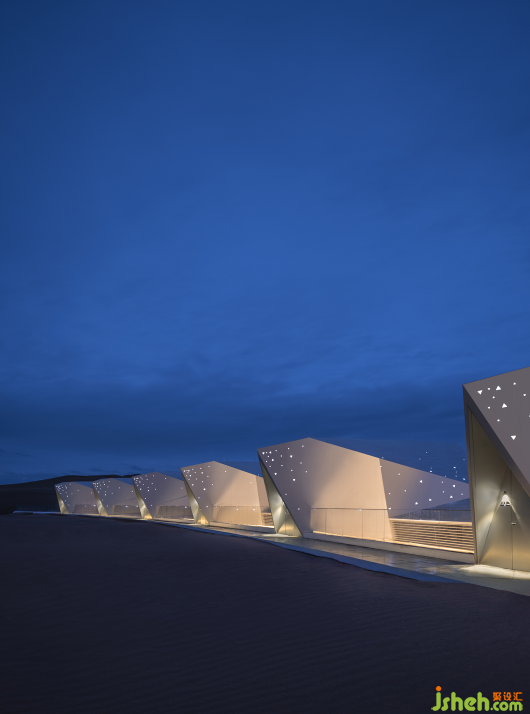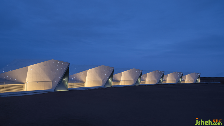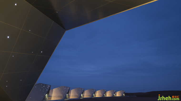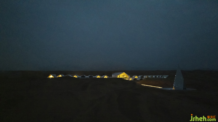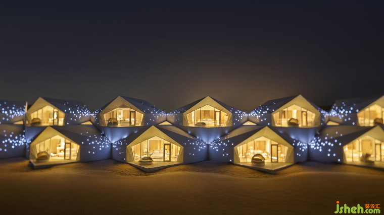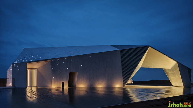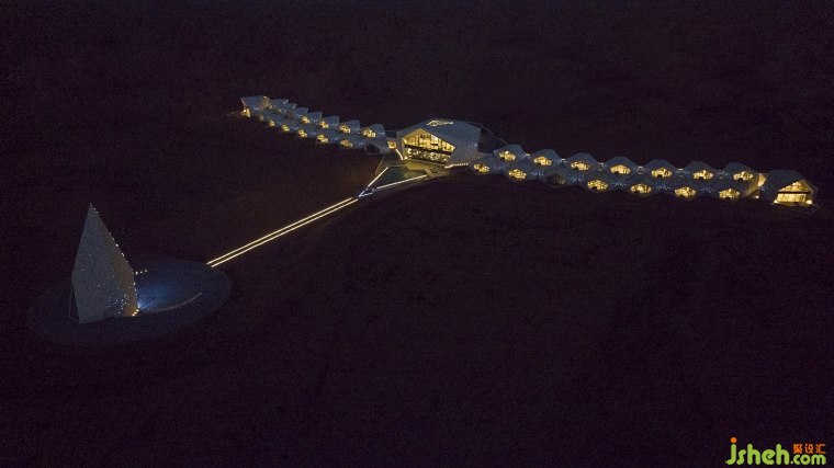 像艺术家一样思考的设计师,其设计作品是一种独特气质的独特结果。杜恒在接手酒店设计任务之前,她来到这片沙漠考察,微醺时在观星谷看星星,星影摇摇欲坠,她随口说了一句“星星落下来,会落到哪里呀......”她体验到了梵高那句话的意境:“我不知道世间有什么是确定不变的,我只知道,只要看到星星,我就会开始做梦”。在沙漠漆黑的夜晚,如果有会发光的房子,接住倏然落下的星星,会不会很美?后因业主方明确要求,要打造一座全球唯一一个沙漠婚礼基地的酒店,时任业主方主管设计管理工作的李雷先生同杜恒一起,想到了钻石的主题,将这片狭长的建设用地做成一串闪耀的钻石项链,让爱与美的纯粹和沙漠这片广袤的时空交融。