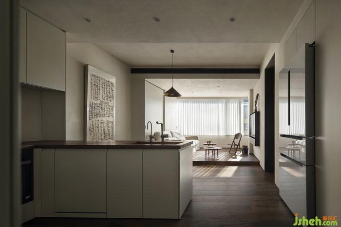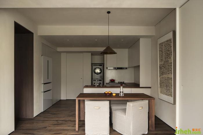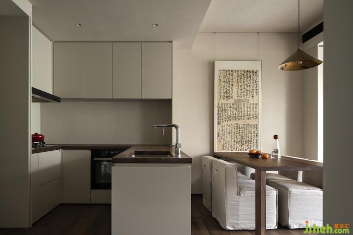 4厘米厚纯胡桃实木厨台面,1.8米长胡桃木餐桌,密字书法、定制纯黄铜吊灯,诉说着无以言表的阡陌流年。