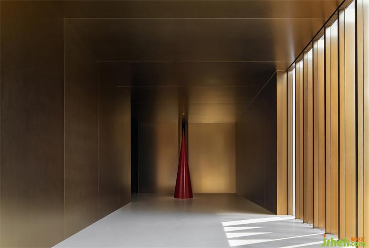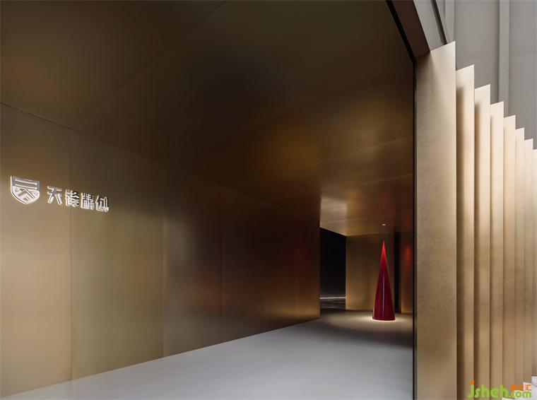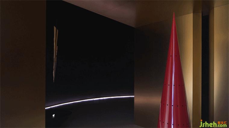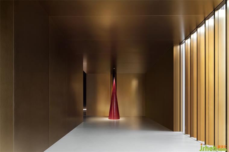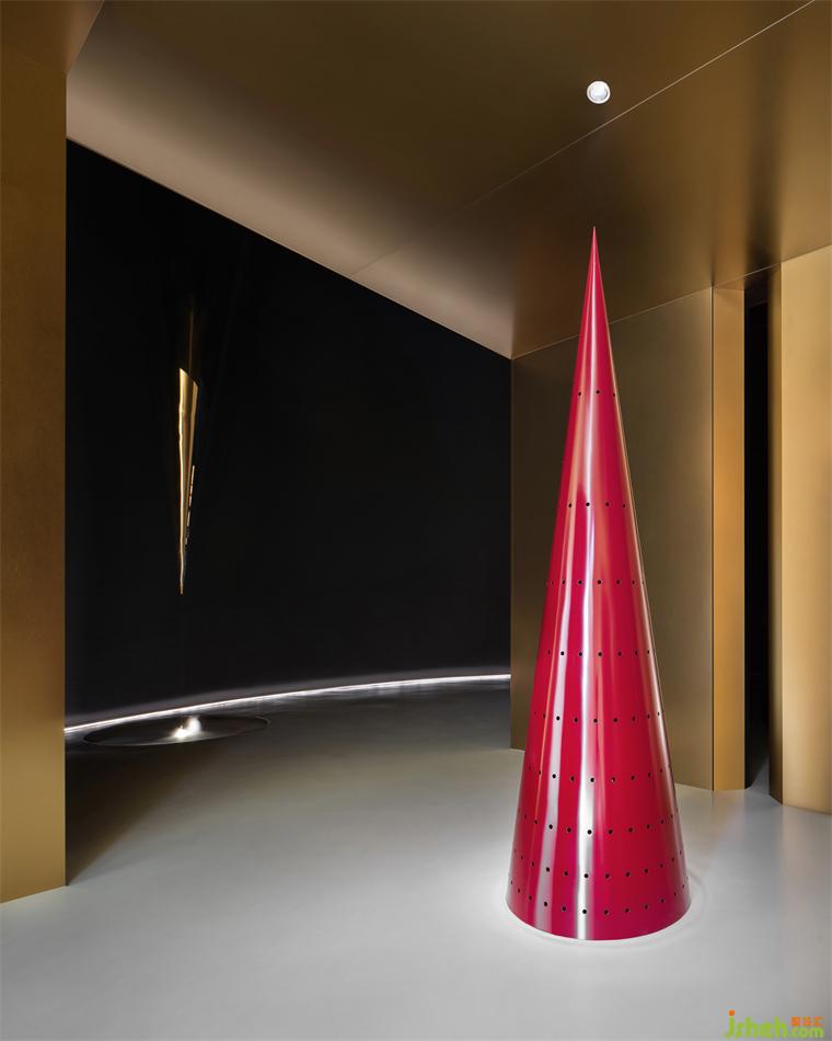 天圆地方,方为实。哑光黄铜的外立面,造就方型的盒子。高1.8m,宽0.5m的红色锥体幻化成圆,直耸方中。铜与锥、黄与红、旧与新,自然与现代切换,求实与创新交互,室内设计师在激烈的市场竞争中如一艘远航的战舰,风正帆悬,工艺叹为精湛。