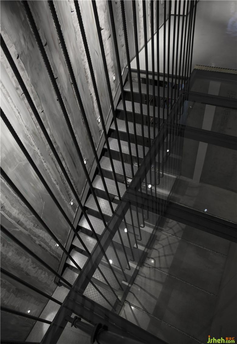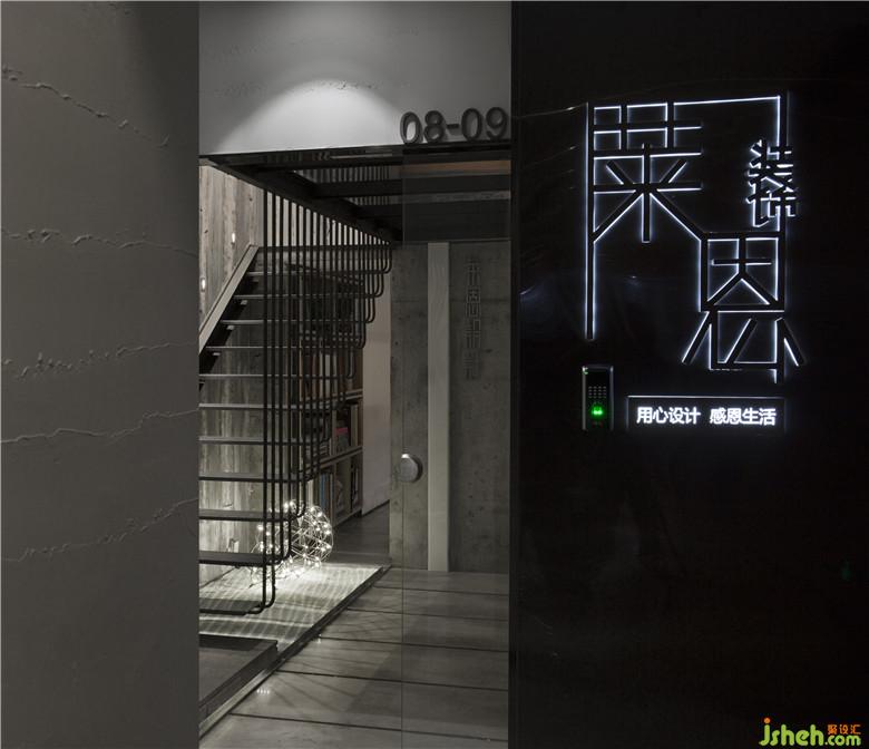 入户门随机的白色腻子底像一层层的波浪,同时与入户玄关的白色灯带和景观沙池形成呼应,办公室设计的黑钛门框及LOGO背板又和工业风的黑色不锈钢楼梯、玻璃栈道、以及玄关的建筑原墙和地面的灰色麻面大理石砖形成一个整体。