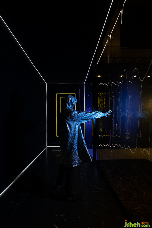 观者在展位外围入口处排起队列,依次摁下登录按钮获取带有专属编号的“船票”,随后即在透着黄色微光的半透明薄膜的引导下,向走道尽头的展位入口走去。