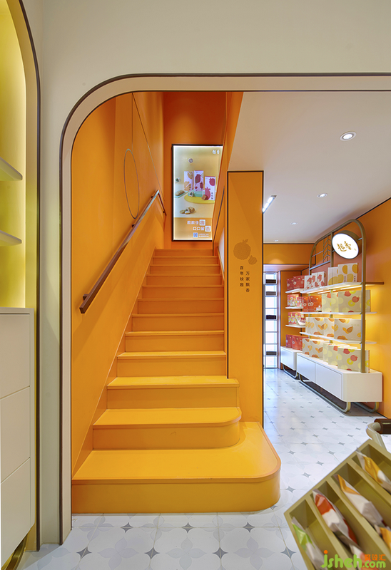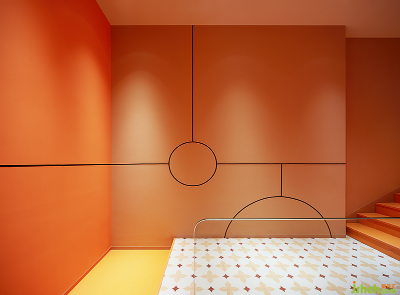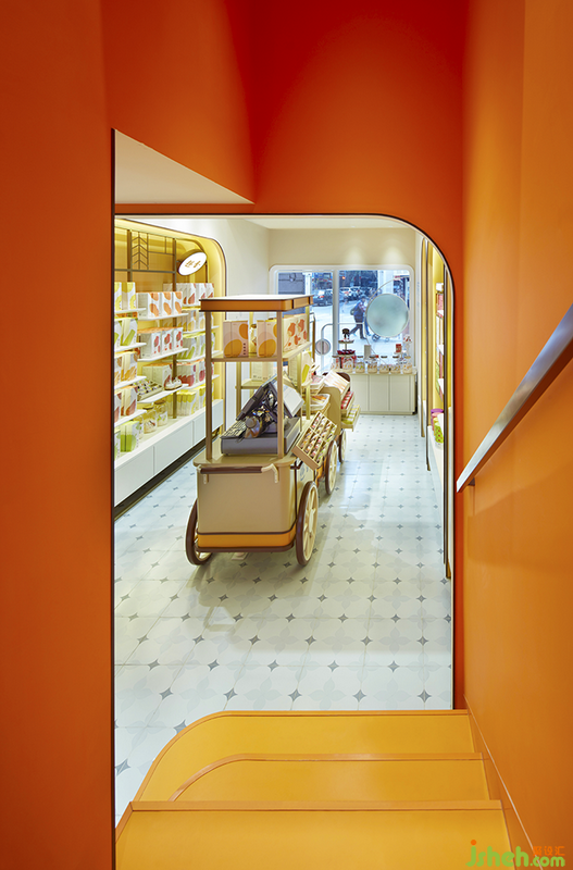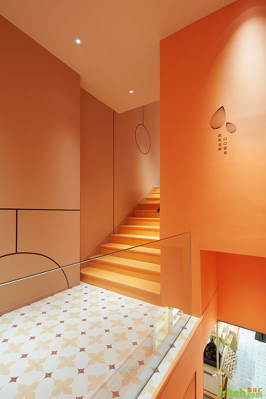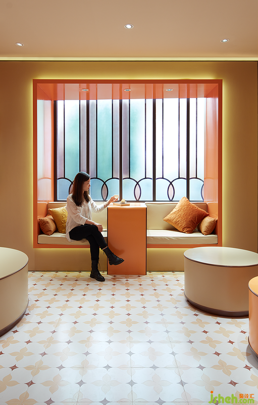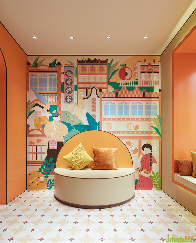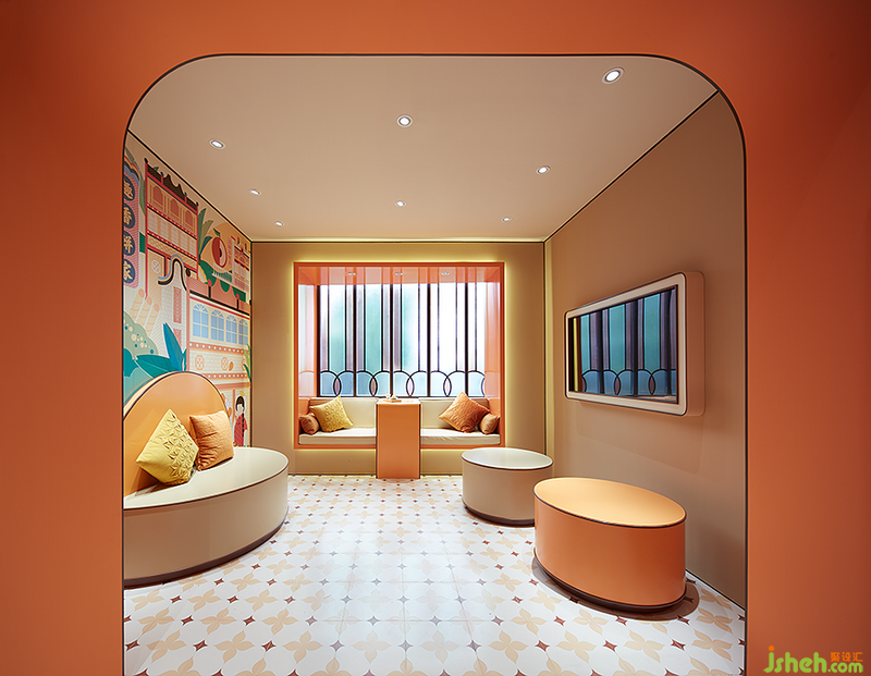 走上楼梯的消费者将进入一个橙色空间,进而来到现代版的西关小姐房间。小空间中融入传统元素的细节:定制花窗、窗边的飘台、西关主题的墙面插画。