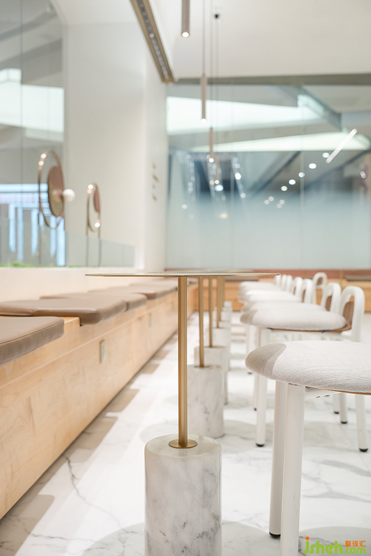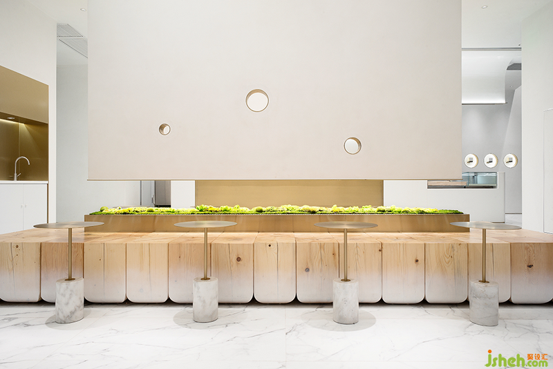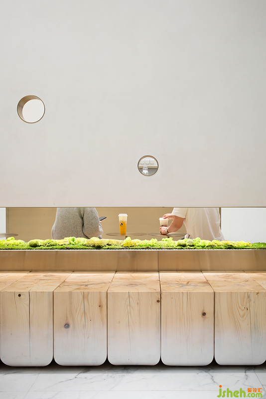 白色渐变油漆结合定制杉木座椅,同样源于对奶盖的联想。