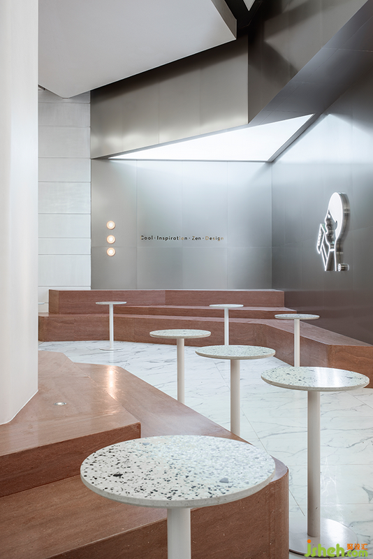位于商场室内的外摆区域选择金属与洞石的材质搭配和阶梯状的座位形式,整体更为轻松、更具活力,呈现开放和欢迎的状态。