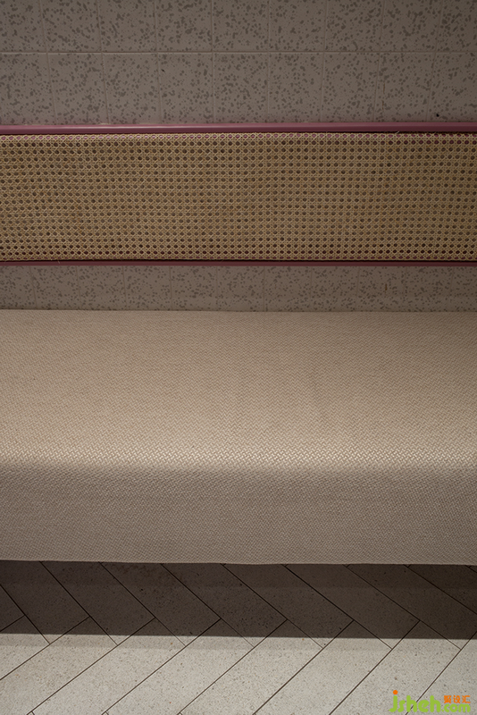 麻石砖以复古人字拼接方式呈现,藤编与麻布质感则带来传统东方庭院的联想。墙面所用定制手工砖上的墨点图案由制砖师傅随机泼墨而成,每块独一无二的砖都拥有同样光滑亲肤的触感。