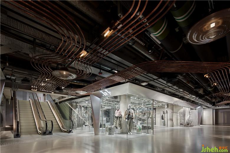K11 MUSEA地处1910's年代香港主要货仓码头蓝烟囱码头旧址,其负一层空间位于海平面以下,工业风格的装饰令整层建筑空间本身便呈现出海底工业遗迹般的独特视觉感受。