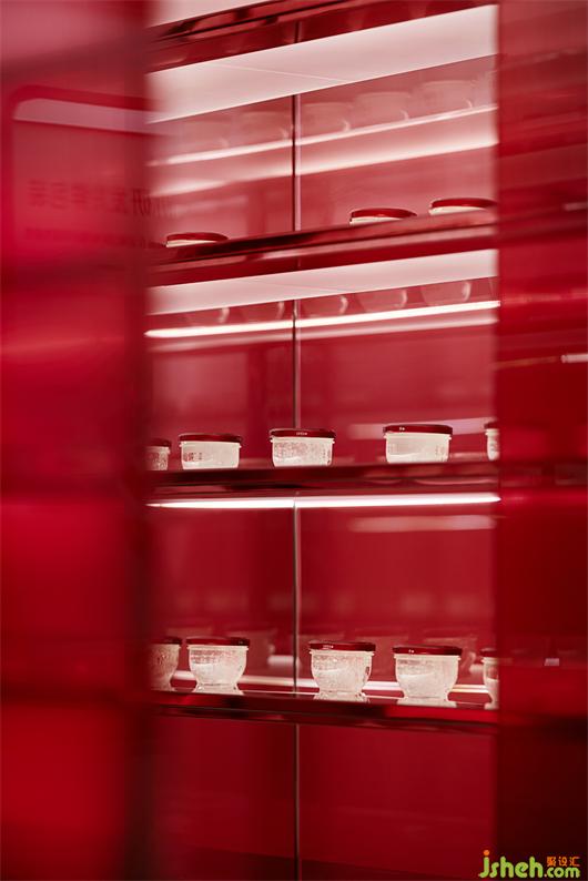 同样以玻璃材质打造的燕窝冰库,成为整个空间的核心张力,将品牌强调的“鲜”这一理念进行可视化传达,通过重叠、对称等设计手法,让空间在这里得到无限延展。