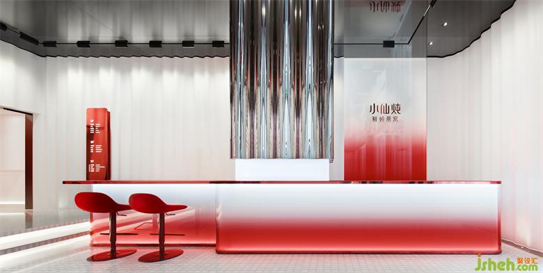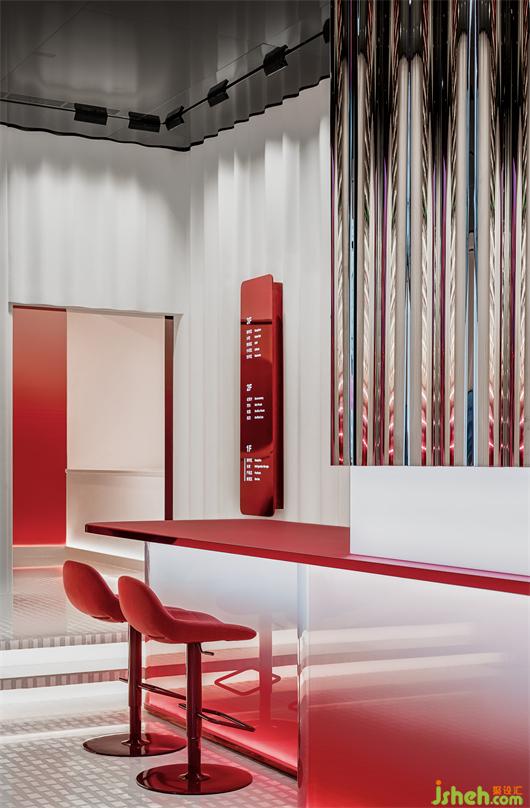 一层接待区柜台正好被一根巨大的柱体插入,采用亮面波浪形态金属包覆后,柱子被赋予了雕塑感,打破了空间的秩序,形成有趣的反差。