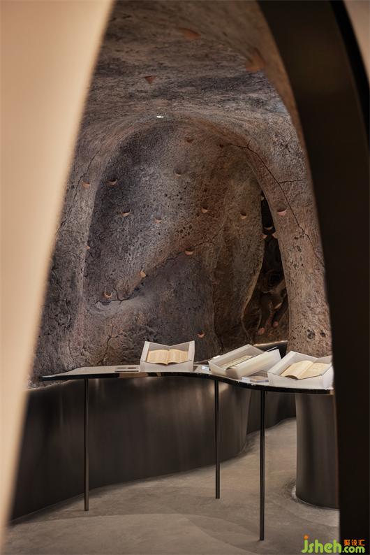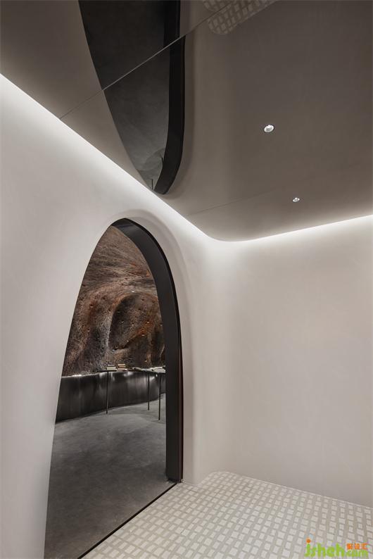 在表达手法上,如何平衡具象和抽象之间的关系?燕洞位于整个体验动线的入口处,以粗砺的岩洞结合金属材质,同时实现原始力量感和现代感。