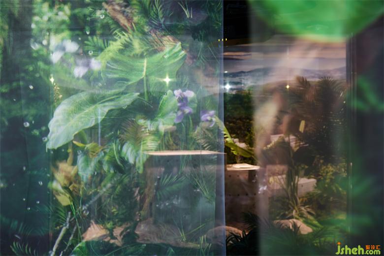 雨林区的营造更符合当下人们拍照打卡的习惯,由Seen Vision呈现的互动影像画面投射在若隐若现的纱幕上,人一旦经过,纱幕上群鸟飞舞,让人仿佛置身于热带雨林之中。