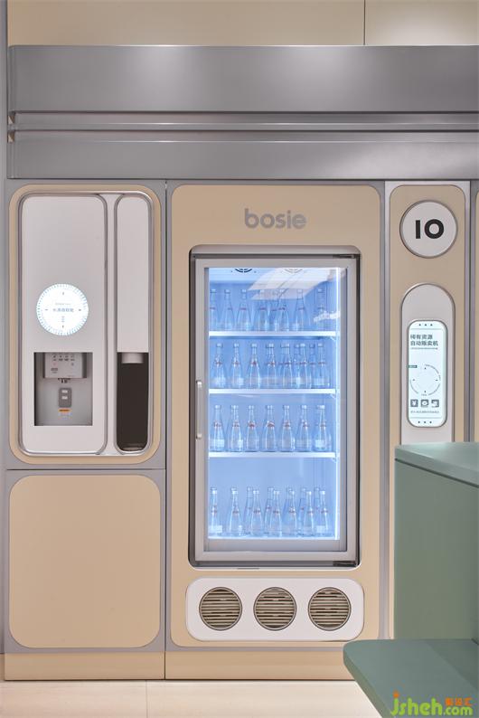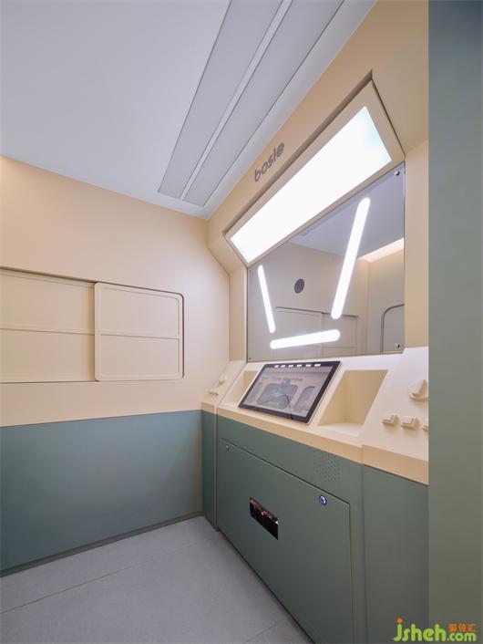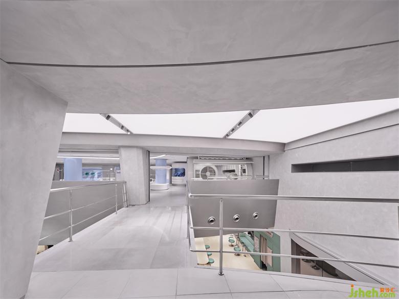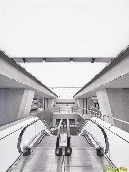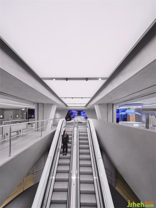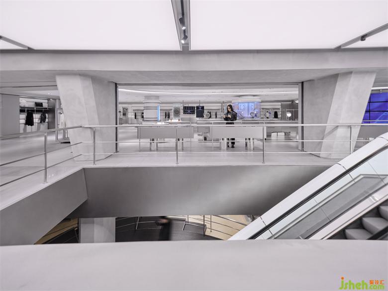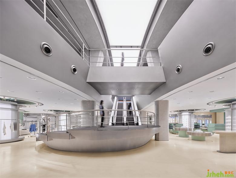 主体造型有着20世纪中叶粗野主义建筑的典型特征,复古科幻的太空风格成为整个空间的底色。旗舰店设计弧形阶梯平台设计规避了扶手梯下方沉箱难题,又与发光扶手梯相连,通过屋顶柔软的光源与大型金属建筑体块形成矛盾反差,营造通往另一个空间的神秘昭示。