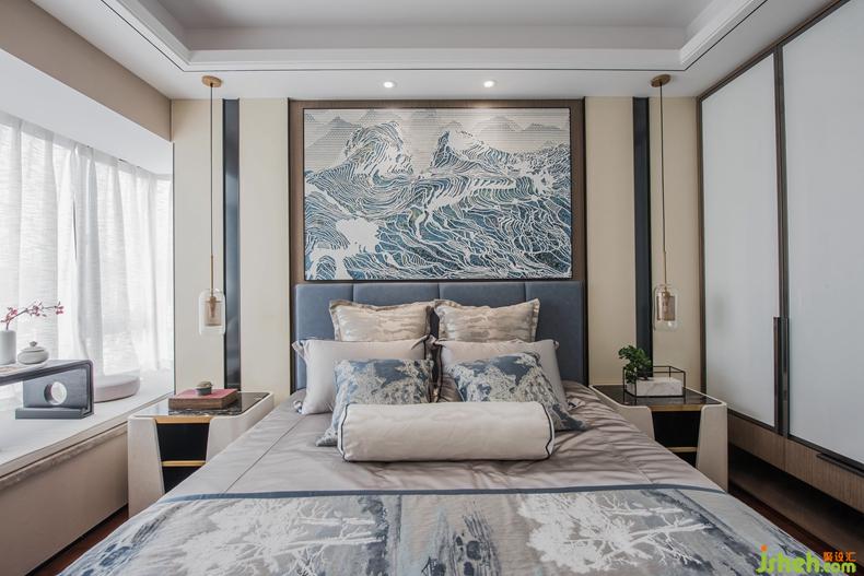 卧室设计上,将自然山水的景色引入空间,在现代生活的环境中结合东方美学底蕴,意在“一卷代山、一勺代水”,令空间居住者自然代入“物象因视觉成景,景因心悟而成境”的无相、万象空间。