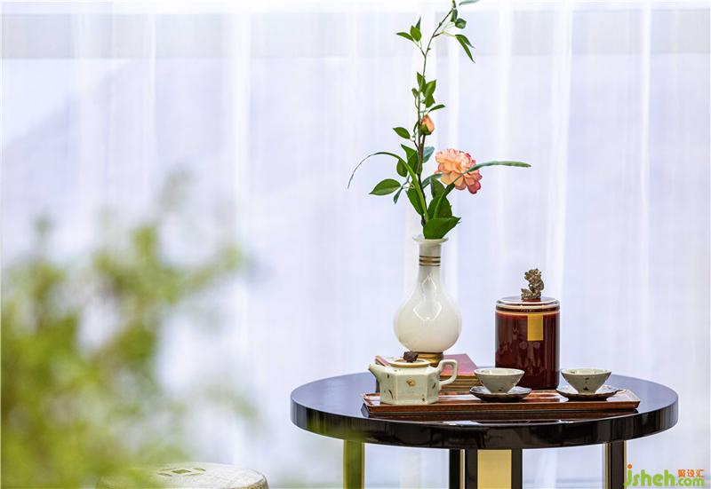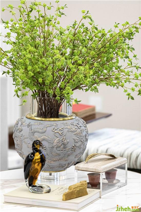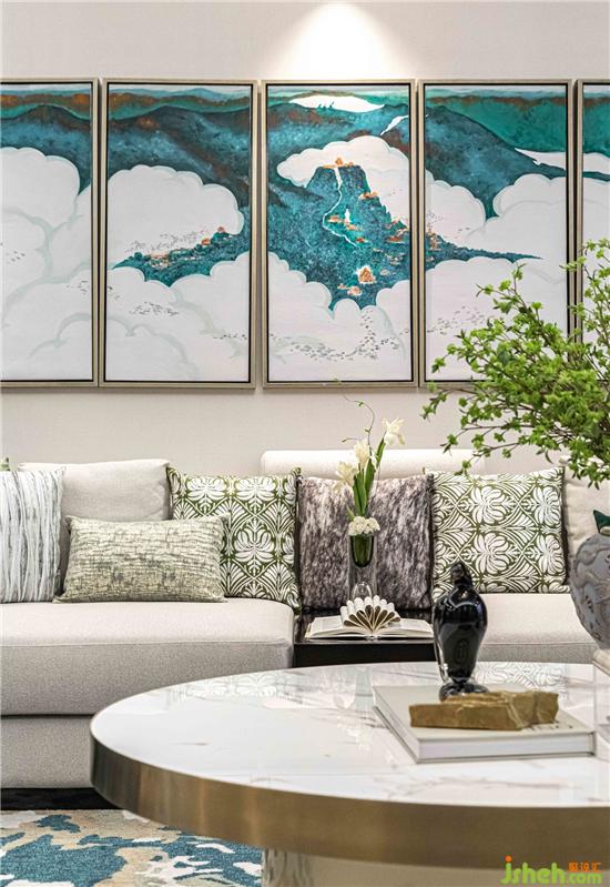 玄关处与客厅间的连廊大面积运用木饰面隔断,与木色展示柜的设计组合,带来了入门的仪式感。松石绿主题的空间打造,让人不禁联想起“苔痕上阶绿,草色入帘青”的疏阔心境。