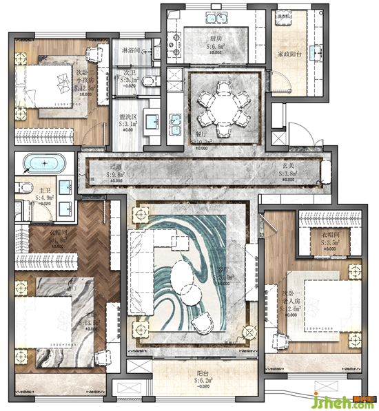 空间设计根据不同的生活需求配设功能分区,在享受共同烹饪带来的生活小乐趣的同时,亦可自由行走空间内,不显拥挤。
