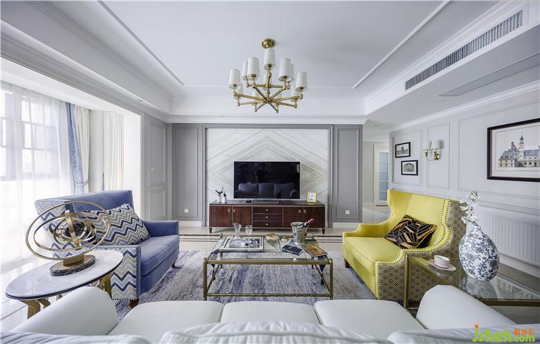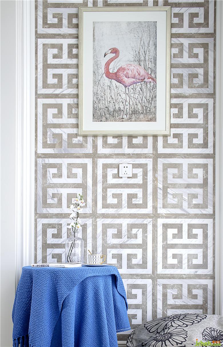 客厅:客厅墙面室内设计师运用的石材经过精心的挑选,由天然的线纹拼出了一个匀称的菱形,象征着世间的规则,茶几和边几采用铜制的边框,而玻璃和大理石台面还有瓷质花瓶的穿插又形成了极富层次感的虚实搭配,由此既为舒适的布艺沙发支撑起了骨架,也填上了一点华丽的意味,同时也象征着除了希望之外,更应该有实现希望的勇气和坚毅的意志。