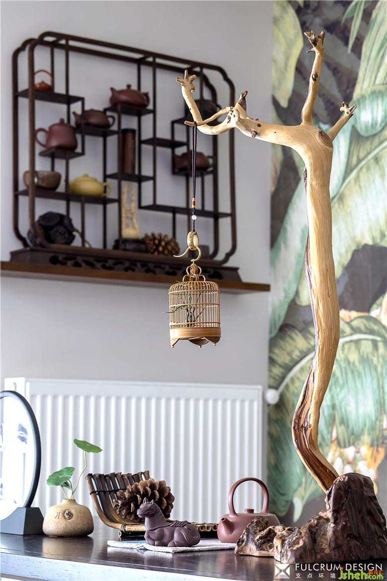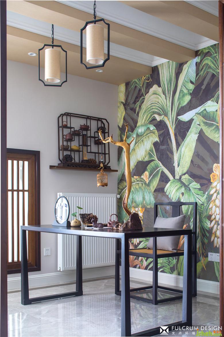 墙面仿佛原始密林的壁画,室内设计师让原本生硬的单调的茶室变得幽静,透过稀疏的纱帘和原木隔断,一缕阳光洒进来,一种怡然自得的感觉油然而生。