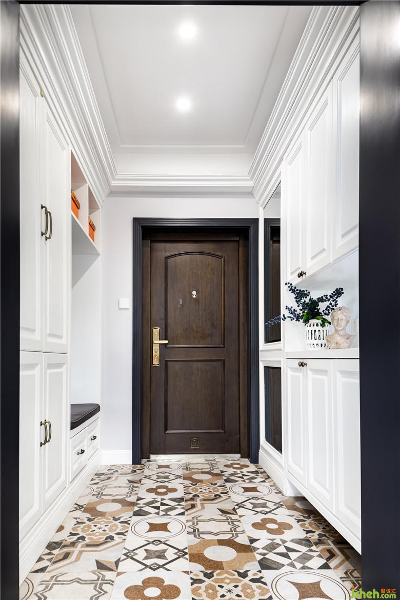 进门处运用厨房与原始暗卫的墙体,室内设计师打造了实用与颜值并重的玄关区。(宝宝再也不用站着换鞋啦。)