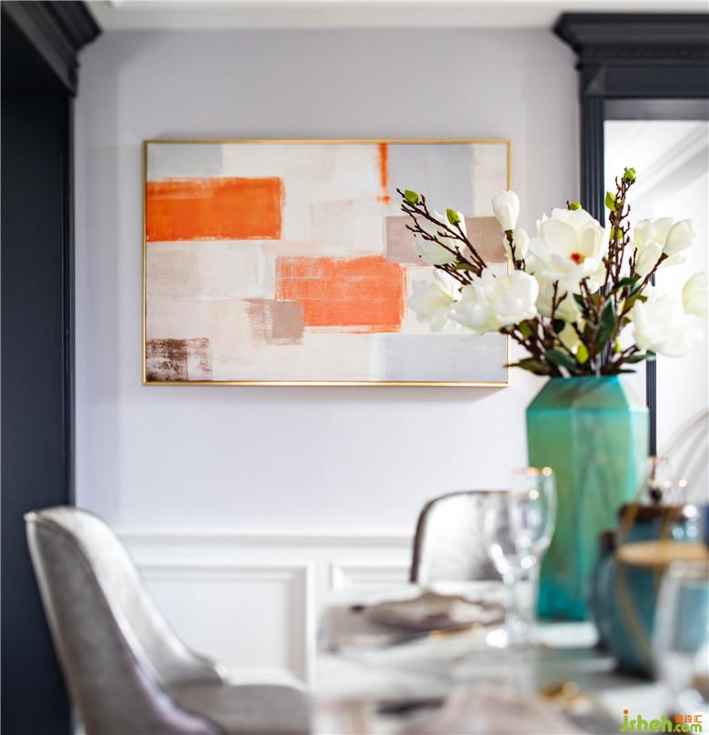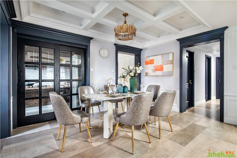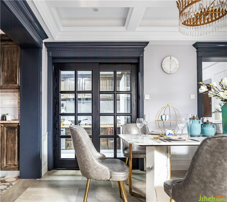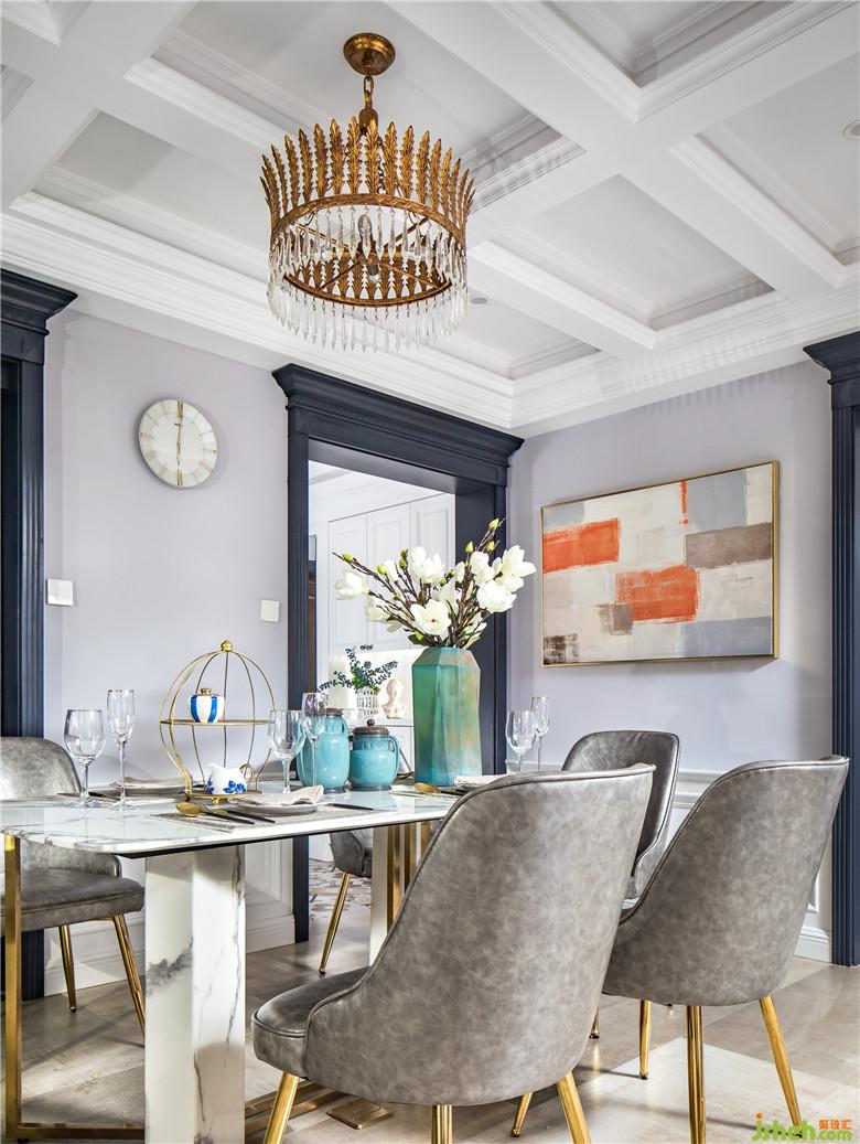 室内设计师使用冷色调的居家氛围,金色的装饰与白色石材餐桌在视觉上起到轻盈灵动的效果。哑光素面的水泥砖加入了随意现代的生活气息,同时在复古线条的硬装中也达到了软装层次的过渡。