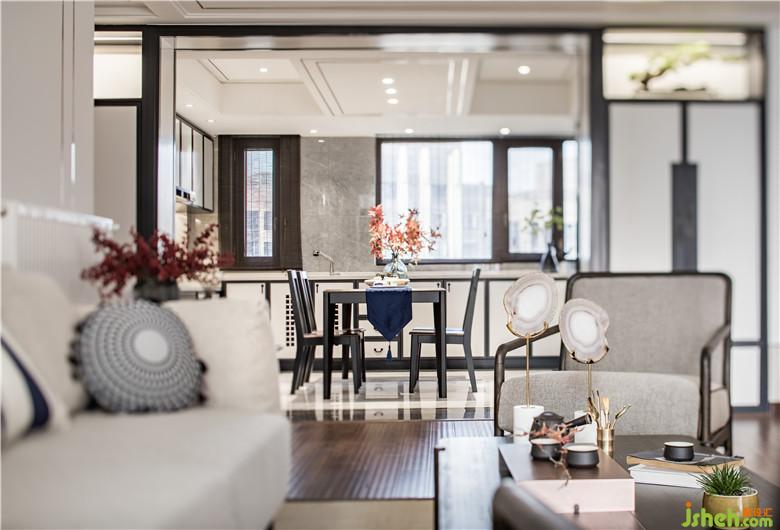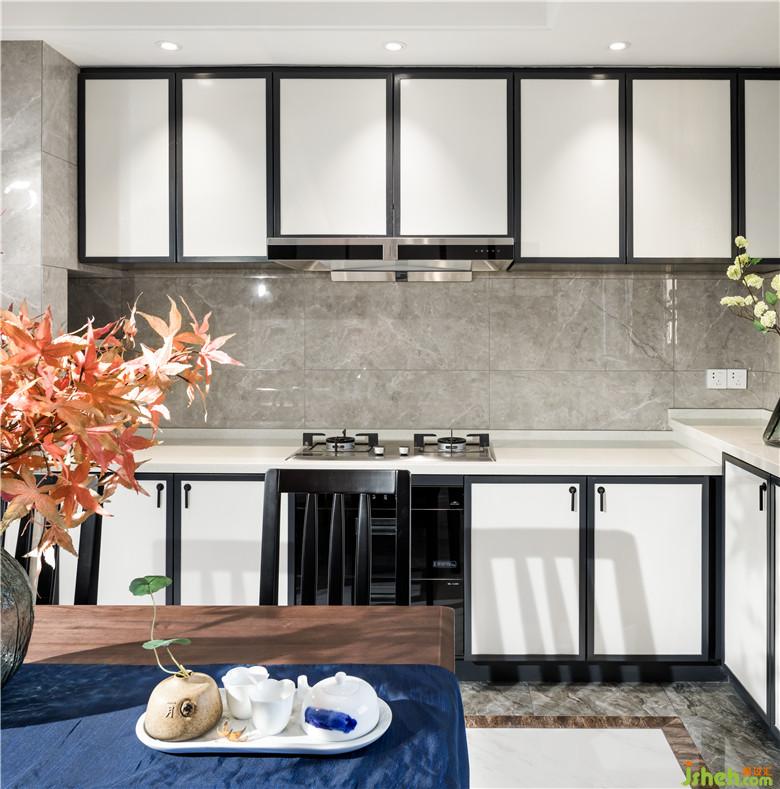 精致的餐厨空间,开放式的空间布局纳入更多自然光线。灰色的墙砖衬托下,黑色边框勾勒的橱柜渗透着东方韵味,餐桌椅采用黑色木纹与胡桃木组合,室内设计师细节上延用了整个空间东方现代的元素,在饰品选择上选用一些隐含中式元素的花器和器皿摆件,在黑白灰的基调中,淡淡的一抹红枫,给整个空间染了色,勾画出一处和睦欢愉的用餐场所。