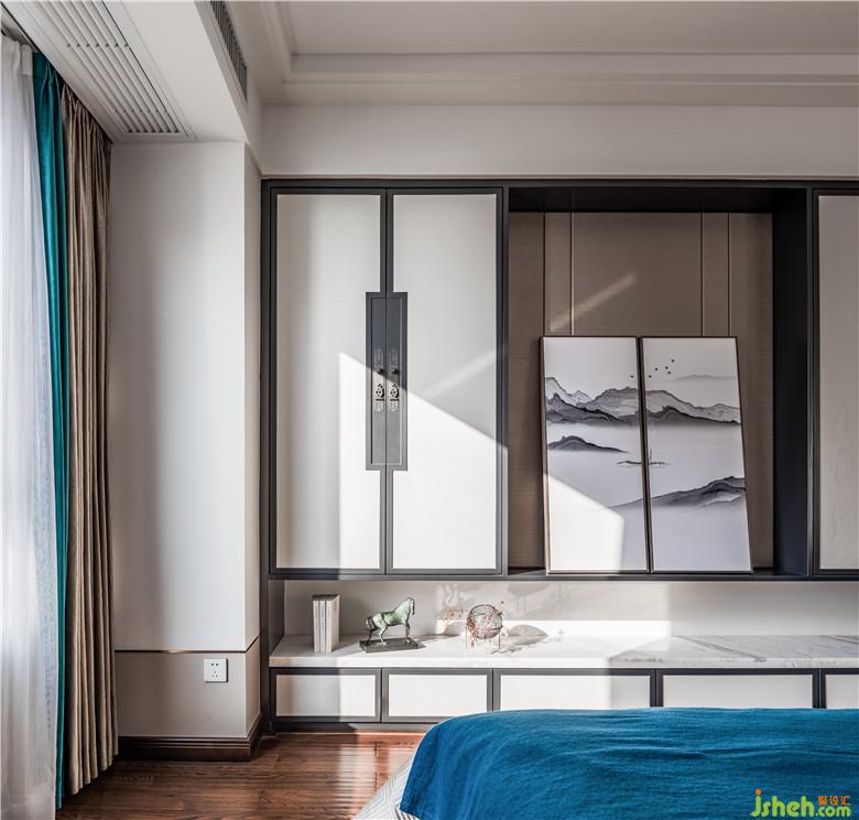 主卧拥有充裕的采光,褶纹的窗帘、洁白的清纱,以及床位处的山间水墨画,与床头落地窗前肆意绽放的花饰交相呼应,使整个空间如同一幅缓缓打开的山水画卷,俊秀清丽,晨曦日落光影交替变换,动态光影的行进中,室内设计师使空间有了更加立体而生动的表情。